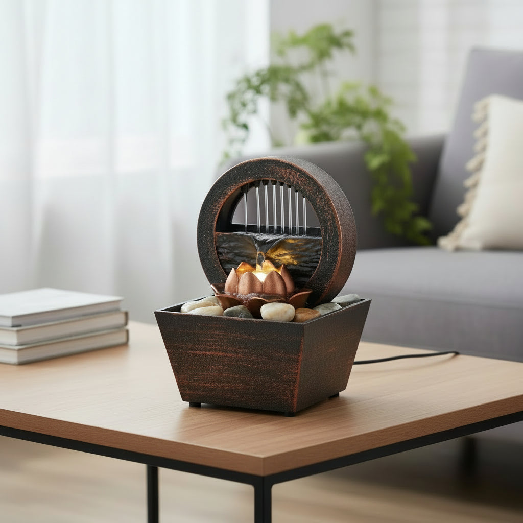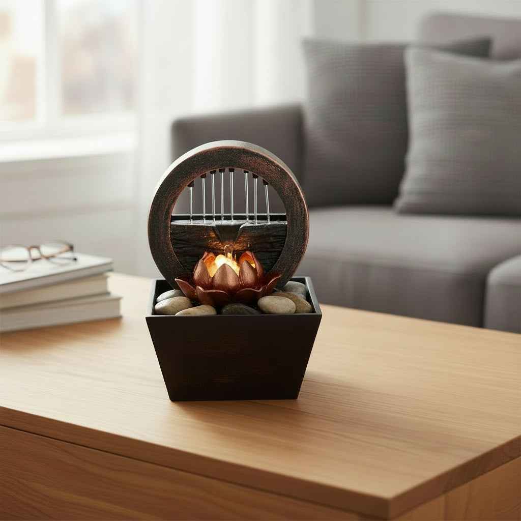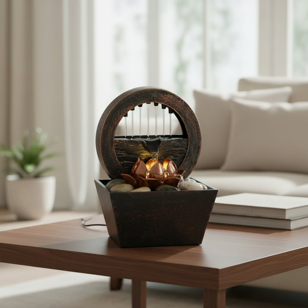 Illuminated Lotus Centerpiece: Features a sculpted lotus flower at the base, enhanced with integrated LED lights that emit a warm golden glow, beautifully highlighting the cascading water.